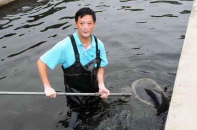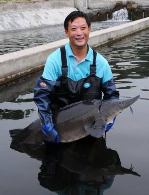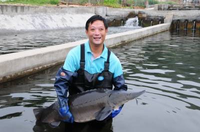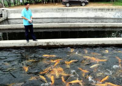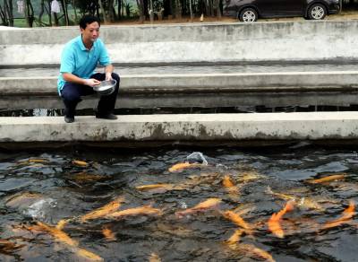 6月22日,郧县南化塘镇西河村虹鳟鱼养殖场的员工们正在给池内虹鳟鱼喂食。据检验师陈泽兵介绍他们是2009年9月投资100多万元从挪威引进虹鳟鱼试养,现发展水面1.5亩,年销售成品鱼20000多斤,产值70多万元,而且成品虹鳟鱼全被外省抢购,他们试养的中华鲟也取得成功,最大的中华鲟已达40多斤。 夲报视界网周家山 摄
