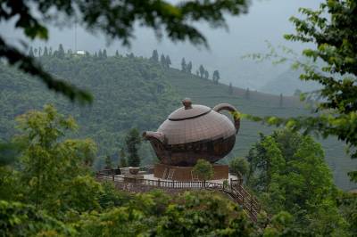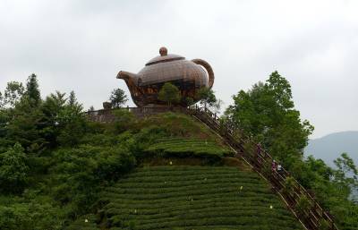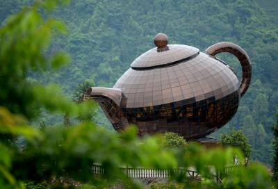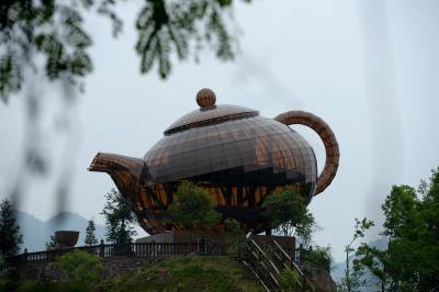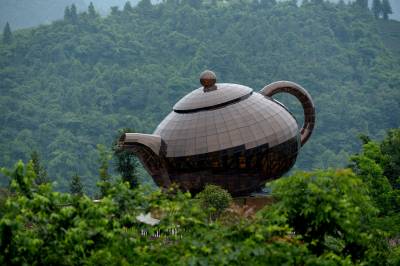 6月22日在宣恩县万寨乡伍家台村拍摄的耸立山头的巨型茶壶。 近日,一把直径16.5米、高10米的巨型茶壶亮相宣恩县伍家台茶叶公园的山头。该茶壶不仅能供前来公园游玩的人观赏,壶内还包含三层品茶间,供人们观园品茶。 伍家台贡茶曾因乾隆御笔题写“皇恩宠锡”匾牌而得名,其原产地茶园已按现代农业模式建成有机茶园,园内建有游步道、休息亭等基础设施,免费供游人进茶园公园观赏休闲。(视界网 宋文摄)