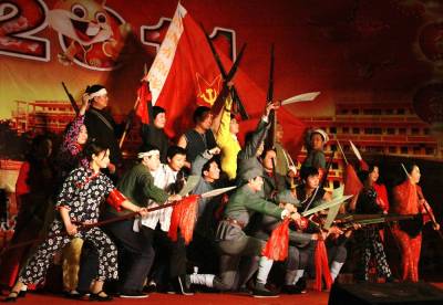 大悟中职校自编舞台剧《洪湖赤卫队》。师生们表演的非常投入。