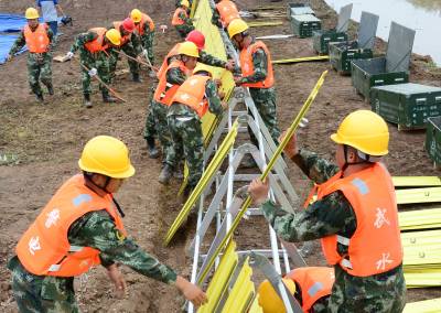 在演练中,武警水电第七支队120名官兵携15台套特殊抢险装备亮相助威,车载式应急动力舟桥,集浮桥、渡运于一体,且每个浮体自带动力,具有架设快速、机动灵活等特点,为今后长江流域的快速抢险打下了基础。液压式震动打桩机,是该支队结合长江流域水文特点及有可能发生的险情而改进的,也成为此次演练的一大特色。同时,七支队运用综合通讯指挥车,4个移动单兵图传摄像机,1个车载云台,1架无人机组成的通信系统,实现演练现场全域图像拍摄适时上传抗洪联合指挥部,为决策者提供可靠信息保障。