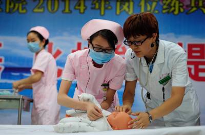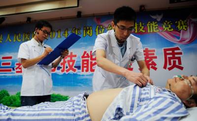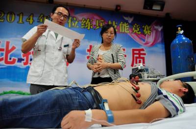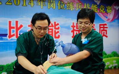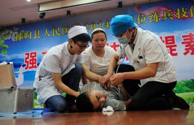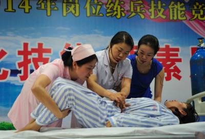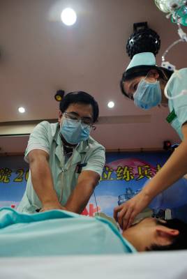 当日是我国第四届中国医师节,三峡库区湖北省秭归县人民医院举办 “强三基,比技能,提素质”岗位技能比武活动。来自该院临床各科的10支参赛队50多名医护人员把工作中常见的患者“心脏骤停、急性心梗、上消化道出血、颅脑外伤、小儿高热惊厥”等多种意外风险设计成生动的场景,以实战演练的方式生动展示了遇到突发情况时,医护人员的专业技能、应急处理和沟通协调能力。(视界网 王家满 摄)