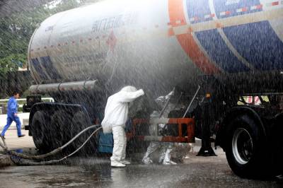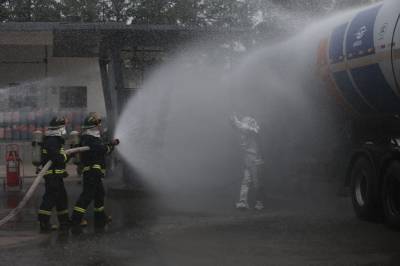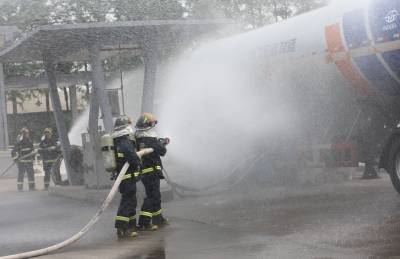 襄阳演练槽车泄漏应急救援 6月27日,数名消防战士用水枪正在对着槽车射水。当日,湖北襄阳美好燃气公司进行液化气槽车泄露应急救援演练,演练模拟灌装站卸车时气相阀破裂发生泄漏,随时可能着火并引发爆炸,对站内工作人员及周边企业和居民生命财产造成极大的威胁。演练内容包括现场抢险救援、人员搜救和医疗救护、人员疏散和危险区域隔离、应急通信和信息沟通等,以提高相关部门和人员应对突发事故的应急处置能力。