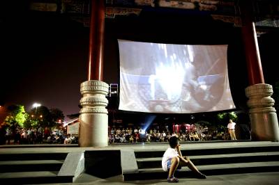 武汉市江夏区文体局在夏季免费为纳凉市民在纸坊街谭鑫培广场播放露天电影,受到市民欢迎。