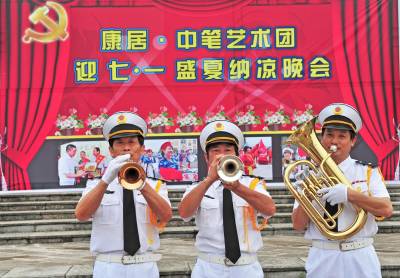 纳凉不忘颂党恩 6月29日晚,宜都市中笔社区的军乐队在表演节目。当晚,该社区在清江公园举行庆“七一”纳凉晚会,参加演出的近百名文艺爱好者,以饱满的热情,现场吹奏了《没有共产党就没有新中国》、《唱支山歌给党听》、《歌唱祖国》等歌唱党歌唱祖国的歌曲,近千名群众观看了演出。 曹礼达摄