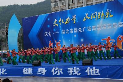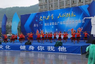 6月30日,由中共宣恩县委宣传部、县委县直机关工委、宣恩县文体局主办、宣恩县群众文化馆承办的庆“七一”,湖北省群众广场舞展演宣恩赛区,在新建的县人民广场隆重举行,.旨在全民健身,开展群众文化活动,推动广场舞,繁荣城市文化。来自全县各乡镇及社区和县直单位共20支代表队参与了本次广场舞展演大赛,演员们的绚丽风采与精湛的舞姿赢得了近万名观众的阵阵掌声。李家河镇凤山村展演的民族舞《凤山莲厢》获得了本次广场舞展演大赛的桂冠;二等奖分别由宣恩城管局、县人社局获得;白鹤井社区、工农街社区等4个单位获得了优秀奖。图为:宣恩县李家河镇凤山村展演的民族舞《凤山莲厢》画面(0572)、宣恩县城管局获得本次展演大赛二等奖展演的《幺妹儿 幺妹儿》民族舞画面(0371)。