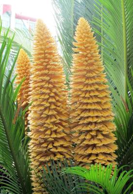 这棵铁树有2米多高,开的花呈纺锤形、玉米棒状,高约70多厘米,黄灿灿的,非常漂亮。