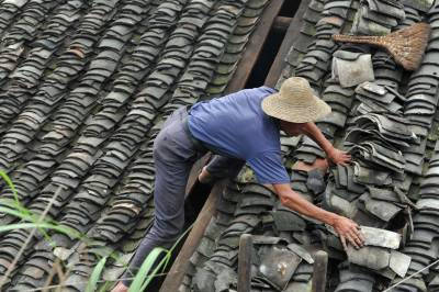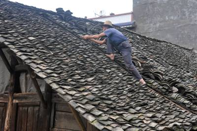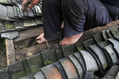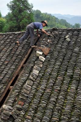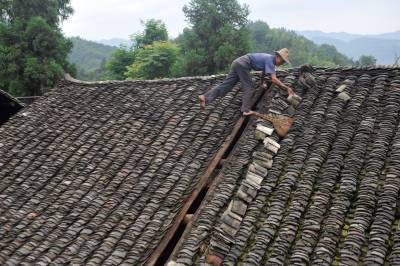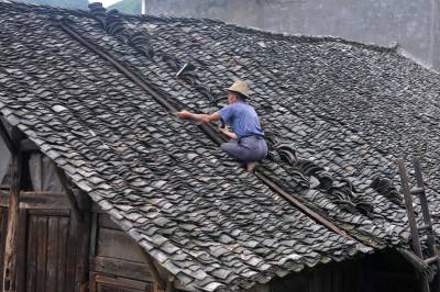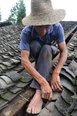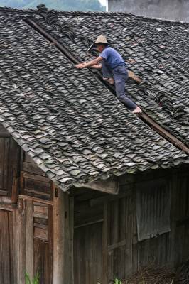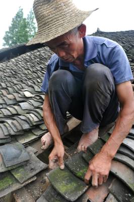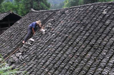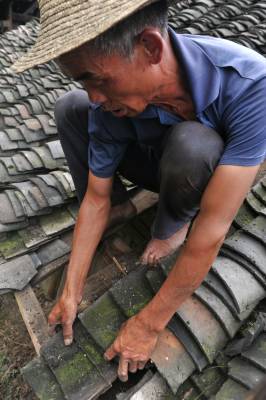7月2日,在恩施市芭蕉侗族乡戽口村,已捡瓦有30多年的瓦匠师龚厚云脚踩椽角,在屋顶上移动,为农户谢先和家捡瓦。