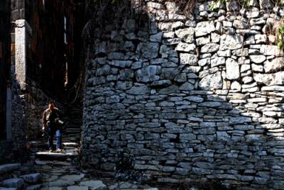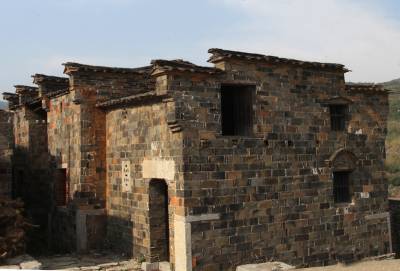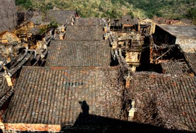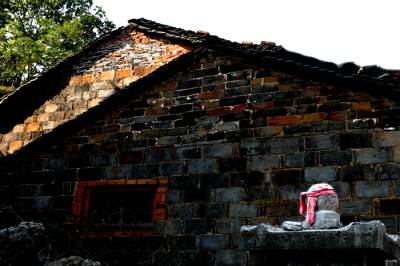 王家湾就深山山坡而建,农户的柴火房,牛栏,猪圈,户与户围墙,户与户走道等都是就地取材,山石奠基,石墙也无需水泥凝固,石阶梯依托山坡自然形成,祖堂的宗词虽说现在看起来巳经不少墙体倒垮,门窗木料大多也已经腐烂,但现在看起来照样是那祥原滋原味原生态,祖宗留下的遗产照样是那样古朴青香,让人深感怀旧而亲切。在山坡上腑视那错落别致的古村古貌,布瓦群,马头墙,也无不让人感叹祖先的伟大。