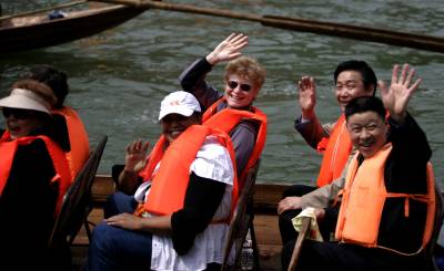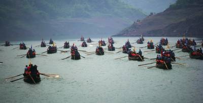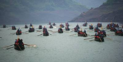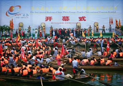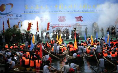 风生水起神龙溪田代明李芬图/文4月18日,神农溪两岸彩旗飘扬,土家儿女披上节日的盛装,绽放青春的笑脸喜迎四方宾朋。近百只”豌豆角”小木船在巴东神农溪江面击水竞渡,吸引了众多中外游客的眼球。”百舟竞渡”是第二届巴东·中国三峡纤夫文化旅游节开幕式的重头戏。昔日平静的罗坪湖湖面热闹非凡,近百只两头尖翘,状如”豌豆角”的木船一字排开,盛装待命。每只船头扎一朵红花,竖一面大旗,蔚为壮观。每只船上的五名纤夫各就其位,蓄势待发;船中十几名观光游客摩拳擦掌,随时准备亲自上阵。湖岸的观看者更是翘首以待。随着发令枪响,”豌豆角”如离弦之箭从起点出发。纤夫们熟练地挥动船桨,一上一下,整齐划一。一时间,如镜的湖面浪花翻卷起来。迎风招展的彩旗,健壮豪放的纤夫,你追我赶的”豌豆角”木船,在江面上展现出一幅百舸争流、百舟竞渡的精彩画卷。舒缓悠扬的《纤夫谣》,高亢浑厚的《船工号子》,伴着纤夫们有力地屈臂、前俯、后仰,动作协调,节奏统一,一只只小巧玲珑的”豌豆角”状若飞梭,穿风破水,快而不乱。游客们心随船动,喝彩声、加油声,呼声如雷。壮实的肌肉,晶莹的汗水,纤夫们粗犷有力的船工号子震撼山崖。一声声号子,喊出了巴东纤夫高昂不屈的气势,喊出了神农溪古老秀美的神韵,喊出了土家人勇敢顽强的雄心。
