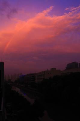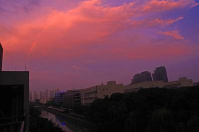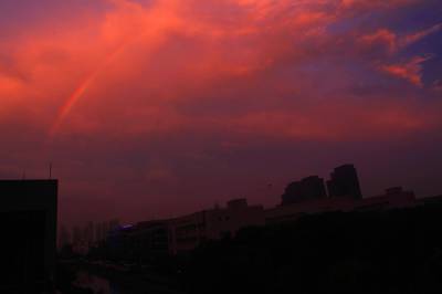 彩虹当空舞 今日18时55分,在我住地的东南方上空现出方圆约90度的彩虹,十分壮丽.(本报视界网 李长凯 摄)13517189948