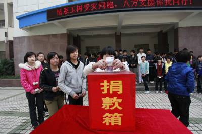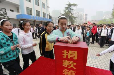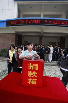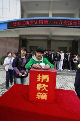 宜昌各界为地震灾区捐款4月19日,宜昌市雷锋中学举行情系青海玉树地震灾区捐款仪式,700多名师生踊跃为为玉树受灾同胞捐款5750.40元。连日来,宜昌市社会各界纷纷为地震灾区捐款捐物,表达一份爱心。本报视界网黄翔摄
