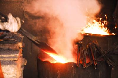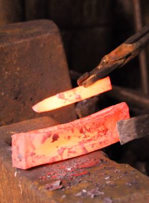 随着铁坯加热的需要,炉膛中的火苗被鼓风机吹得呼呼直蹿。眼看火候一到,铁匠师父就麻利地将烧红适度的铁坯夹到砧子上,指挥徒弟抡起大锤锻打,师父左手握铁钳翻动铁坯,右手挥动小锤,用一种特定的击打方式指点大锤需要击中的位置和力度。随着“叮咚、叮咚”有节奏的响声,几个回合下来,铁坯就变成了各种各样的铁器。再次回炉后,师父夹着回火的铁器伸进水缸里淬火。“滋”地一声,一阵白烟飘起,红彤彤的铁器瞬间变成了铁青色。淬火完成,整个打造过程结束。