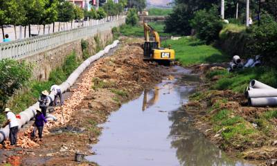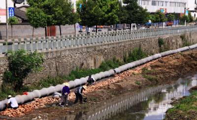 7月7日,竹山县宝丰镇污水处理厂配套建设污水管网店子街河道上,工人们正忙碌着铺设大型水泥管。据悉,该县今年总投资9465万元,在宝丰、麻家渡、擂鼓等9个集镇建设污水处理厂。工程全部完工后,可解决28万人的生活污水处理问题。将进一步改善改善水质、人居环境,降低水污染,确保“一江清水”送北京。