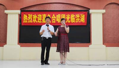 洪湖是湖北省最大的淡水湖,万顷碧波,映日荷花别映红,乘舟 采莲 赏花 高歌一曲《洪湖水浪打浪》,令人心旷神,嘉鱼群星合唱团是民间群团组织,应洪湖荷花艺术团邀请,同台演出,相互学习,共同提高,两地文艺爱好者,各自表演地方特色节目。洪湖荷花艺术团的《洪湖水浪打浪》,嘉鱼群星合唱团的莲湘舞《大喜的日子》把演推向高潮,