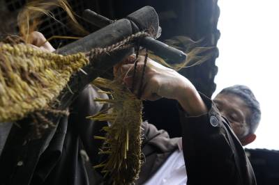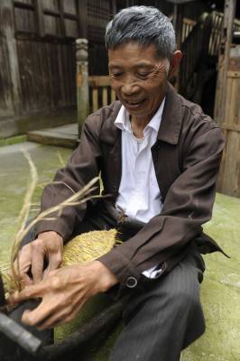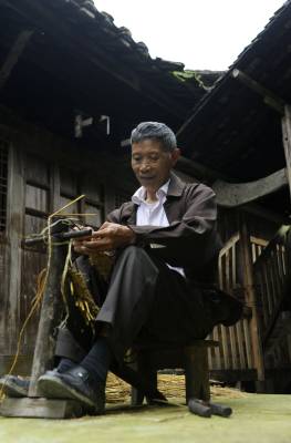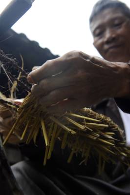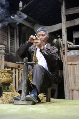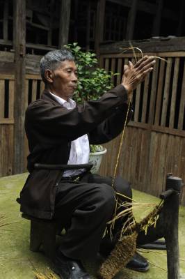 7月8日,恩施市盛家坝乡二官寨村村民康伦锡在吊脚楼前编传统土家草鞋。