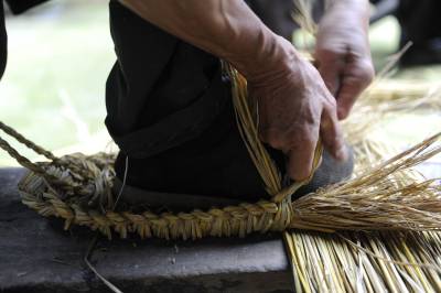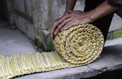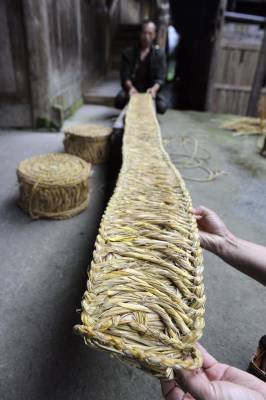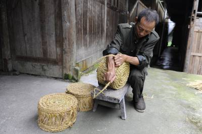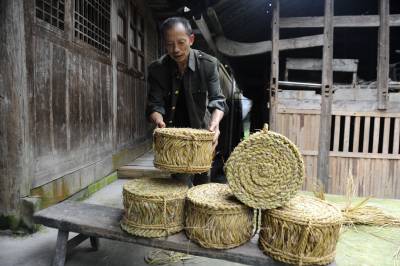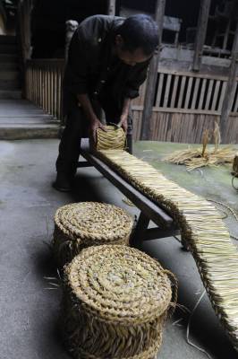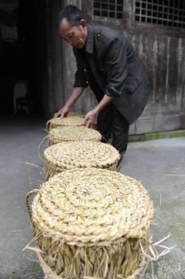 7月8日,在湖北省恩施市盛家坝乡二官寨村旧铺组,农民康朝培在制作草墩。(农民康朝培把编织的草墩进行摆放整齐。)