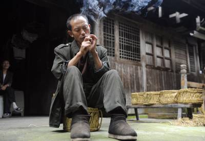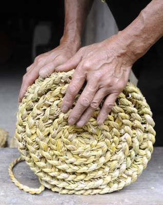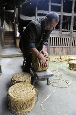山寨花甲老人制作草墩倡环保