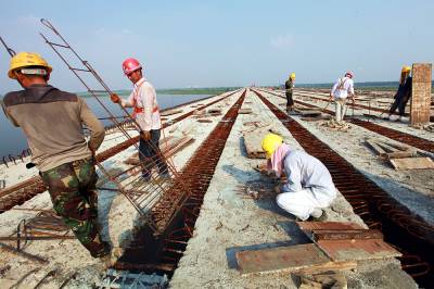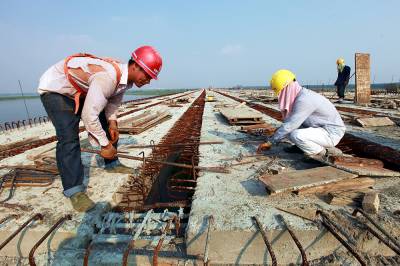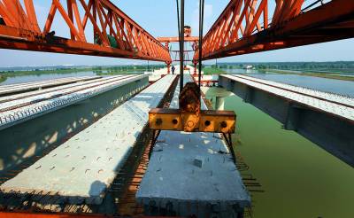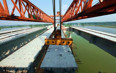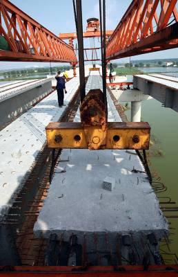 7月8日,在白水湖大桥孝感段,施工人员顶着高温吊装T梁,1.8公里外的武汉天河机场T2航站楼就在目力所及。白水湖大桥是孝汉大道连接的快速通道,全长4.56公里,其中孝感段2.46公里,武汉段2.1公里,桥宽32米,预计于2015年5月竣工。截至当日,已完成桩基340根,占比率100%;完成系梁138组,占比率84%;完成墩柱276根,占比率84%;完成盖梁128个,占比率77%;完成T梁架设695片,占比率60%,完成投资1.5亿元,占总投资的63%。