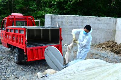 7月9日,恩施市三岔乡阳天坪村病死动物尸体集中处理池,工作人员正在处理病死猪。 今年,该乡建立病死动物尸体无害化处理新机制,自7月1日起,辖区内畜禽规模养殖场(户)不明原因死亡的畜禽尸体将不得随意丢弃、填埋、变卖,由乡畜牧兽医服务中心登记备案后,统一由亮净公司收集,运到无害化处理池进行集中处理。截至目前,已集中处理动物尸体21具。(视界网 童秀清摄)