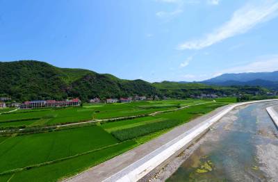 图为治理后的保康县马良镇鸡冠河大堤景观与乡村田园形成一道靓丽的风景线(7月2日拍摄)。 (视界网 陈泉霖 摄)