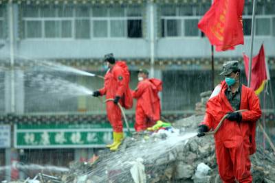 昨日中午12时30分,防化官兵冒雪,正在对玉树扎西宾馆倒塌现场喷洒消毒液。昨日是玉树地震后的第七天,由四川内江某部防疫队承担的灾区大规模防疫工作正式开始。