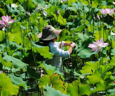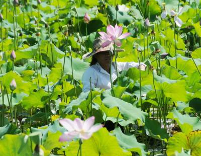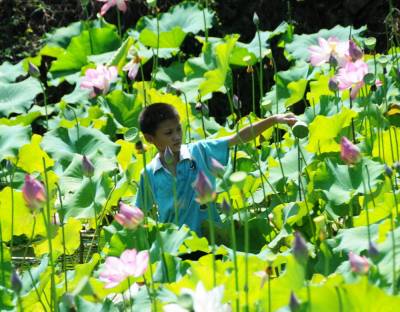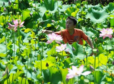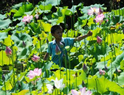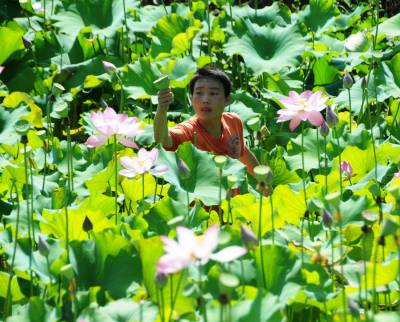 7月14日,许多游人到郧县樱桃沟村采风创作并欣赏盛开的荷花,现场观看大人和放假的学生在荷塘中采集莲蓬。时下正值署假,孩子们在完成作业的同时帮助父母干点家务,照片中的俩个孩子正在荷塘中采集莲蓬,然后卖给游人以贴补家用。 夲报视界网周家山 摄