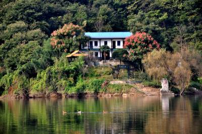 办公室墙壁上的一幅照片引起了记者的注意,远处是朦胧的山丘,笼罩着一层轻纱,两旁苍翠的群山重重叠叠,山前山后繁花似锦,中间镶嵌着一汪安详静谧的湖泊,右侧一座小亭玲珑别致,仿佛世外桃源。“这不是别的地方,正是我们潭口水库的悠南山”,黄彩勇自豪地介绍道。