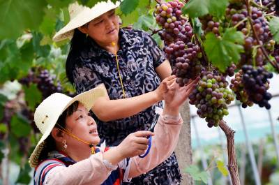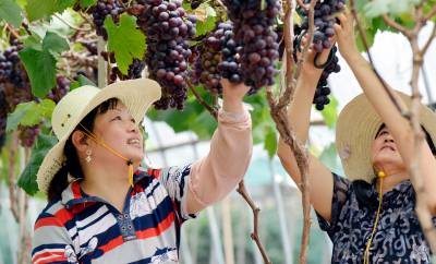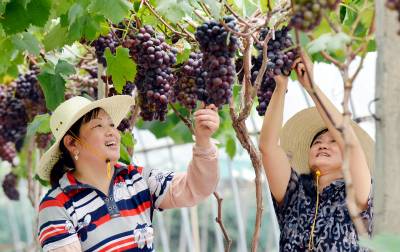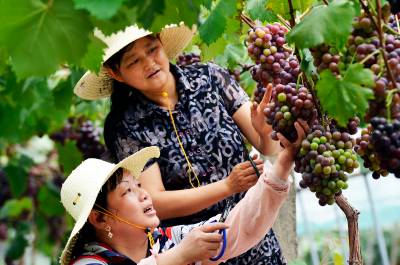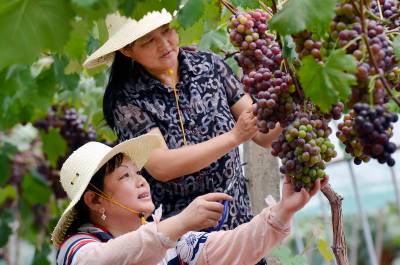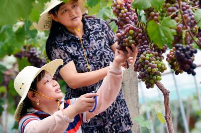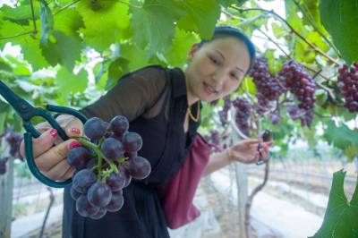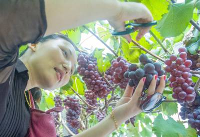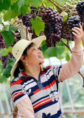 7月14日,云梦县伍洛镇中丁村云霓葡萄园一片欢声笑语。 一串串红的、紫的、粉的葡萄、提子格外诱人,农民正在采摘成熟的葡萄,不时会有当地及一些路过的游客来此体验自摘葡萄的乐趣。该园位于316国道边,2008年由随州人倪国高、段艳芳夫妻在此创建的家庭农场,种植面积30亩,40多个葡萄大棚,有京亚、京蜜、夏之红等优质葡萄品种30多个,每年可采摘3至4季,采摘量占总产量一半,年接待游客5000人次,年产红提、葡萄3万斤,产值40万元,产品主要销往省内外大型超市。