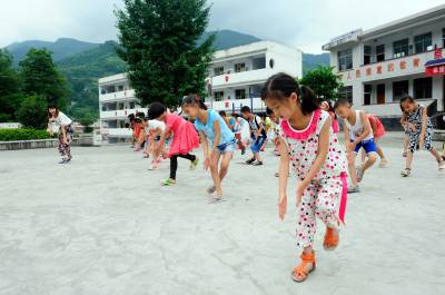 7月14日,在恩施市龙马小学,留守学生在大学生村官秦旭的指导下学跳清江舞。