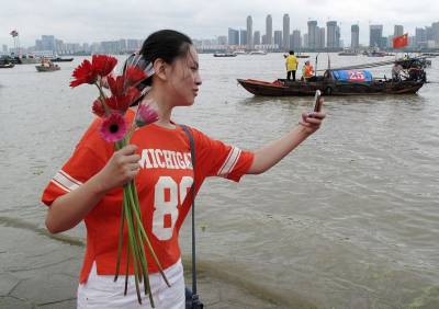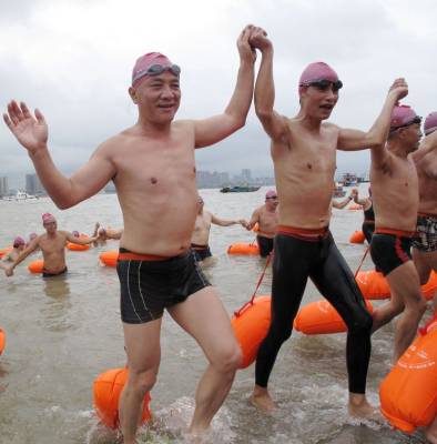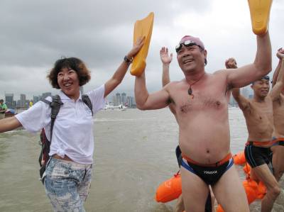 2014年7月16日,参加中国武汉第41届国际横渡长江活动的湖北方队队员起水时与家人击掌祝贺,共同欢庆胜利。