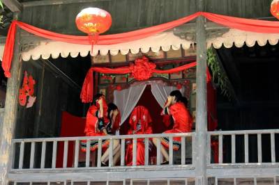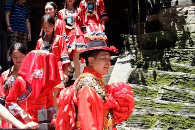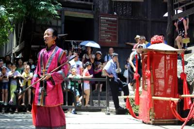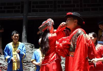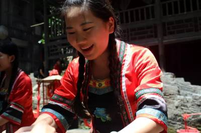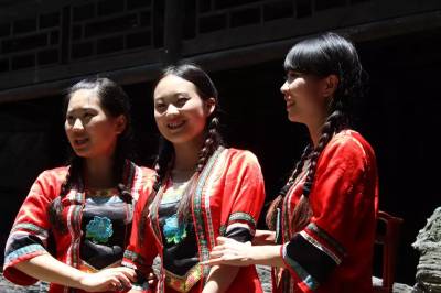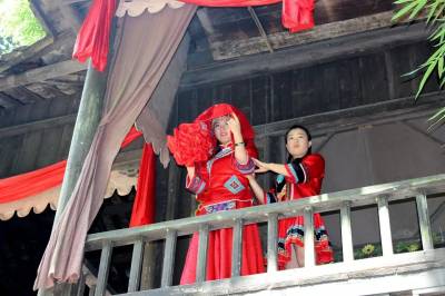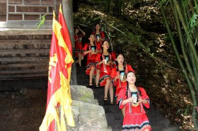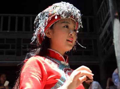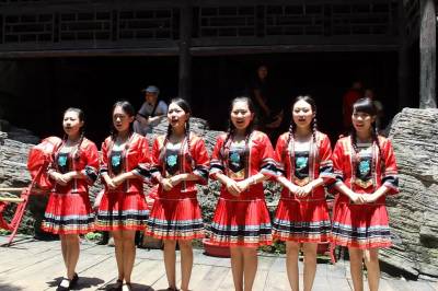 相机是不用关的,进入镜头的都是画,让人美不胜收。返回的途中,到了土家族族木楼前,坐下来等着欣赏民歌和婚俗表演。太阳透过树叶洒下来,有些热了,是不是土家姑娘的热情呢?那就在这些图片中寻找答案吧。