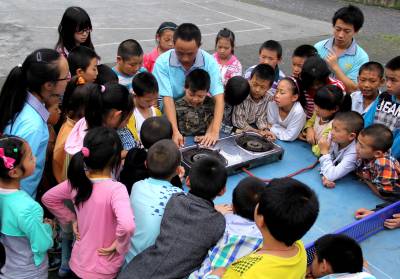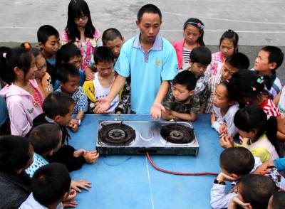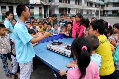 16日,志愿者教孩子正确使用煤气灶。暑假期间,中国地质大学(武汉)山中花儿爱心助学团的大学生志愿者在巴东县金果坪乡泗井水开设“山中花儿”乐园,教小朋友做暑假作业,普及安全知识,为孩子们营造别样的暑期生活。本报视界网田恒钊 朱柄臣/摄 13403007711