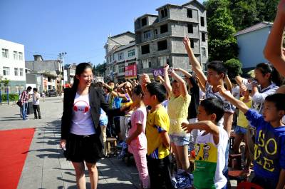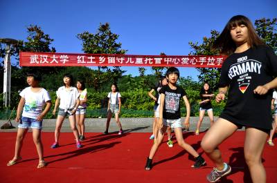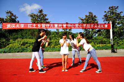 7月16日,在恩施市红土乡文化广场上,武大学子与留守娃展演爵士舞。