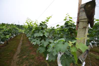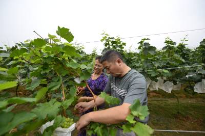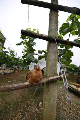 7月17日,蕲春县赤东镇徐亮村“金土地农庄”技术人员为葡萄修剪枝条。这个占地200余亩的葡萄园由黄石商人王贤明投资兴建,采取葡萄园套养土鸡生态循环模式运作。最近几年,类似特色农庄在该县发展到400余家,既美化乡村环境,又带动当地7000多人就业。(视界网 余立鹏摄)