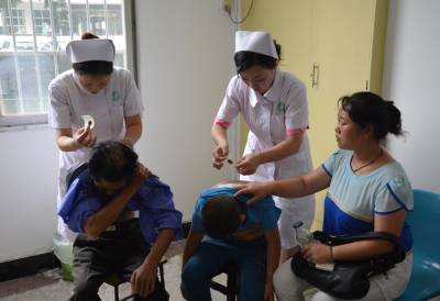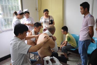 7月18日是头伏,被梅雨季节困了好长时间的大冶市正好天气转晴。一大早很多市民就来到该市中医医院门诊部排队,接受敷贴。今年,该院针对过敏性鼻炎、冻疮和哮喘、咳嗽等呼吸道疾病等冬季常发易发疾病制备了充足的药贴,以满足患者的需求。图为7月18日,该院医护人员热情为病人敷药贴,场面十分火爆。 宫少华 石朋庆 摄影报道