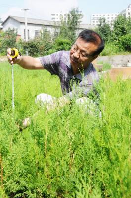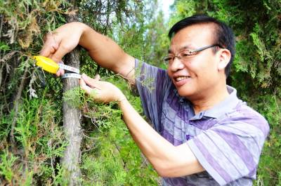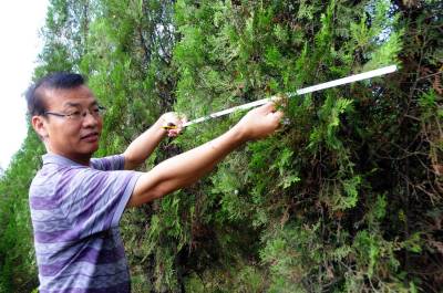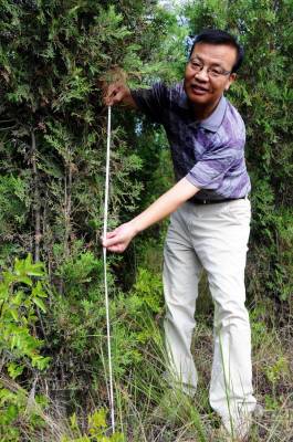 7月20日,郧县林业局林科所技术人员正在杨溪铺镇后山梁上2005年在石漠化荒山上栽植的耐旱柏树进行树高、树冠、胸径生长情况进行追踪测量。郧县汉江北岸是石漠化荒山比较严重的地区,为保持水土不流失,确保一江清水送北京,郧县近几年加快石漠化荒山绿化治理,己植树20万亩,早期载植树木已初见成效,让秃山戴绿帽。 夲报视界网周家山 王燕摄