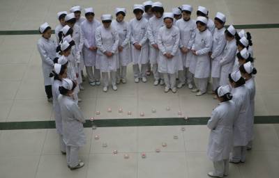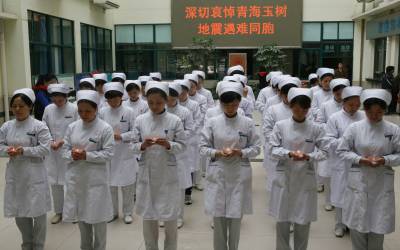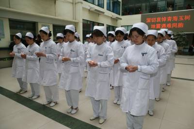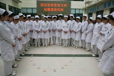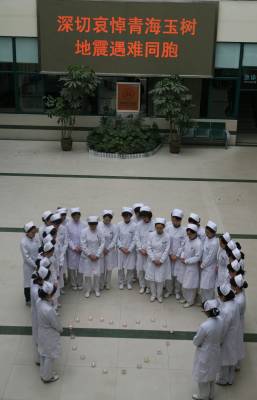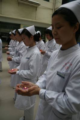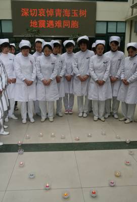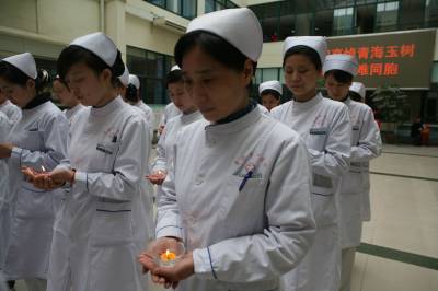 4月21日上午,湖北省襄樊市第一人民医院医护人员手捧蜡烛,为青海玉树地震中的遇难同胞默哀3分钟,愿生者坚强,逝者安息。