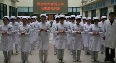 > 医护人员为地震遇难者默哀