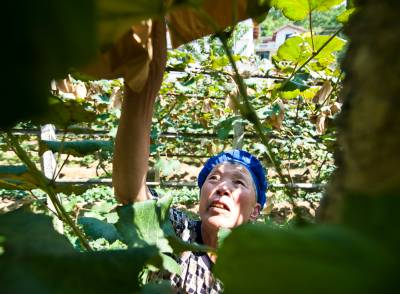 7月22日,恩施市龙凤镇二坡村的一位留守老人正在管护葡萄园。 留守老人是当前我国“三留”(留守老人、留守儿童、留守妇女)人员中,最需要关心的群体。在湖北省恩施市龙凤镇,外出务工人员很多,留守在家的老人没有体力种地,没有其他经济来源,又不想给儿女添麻烦。于是,留守老人在当地政府引导下发展庭院经济,在房前屋后种植不需要耗费多少体力的果树。同时,利用城郊优势,吸引城区市民前来体验农事。目前,该镇葡萄种植面积已经接近一千亩,亩收入在5000元以上。本报视界网 王波 摄