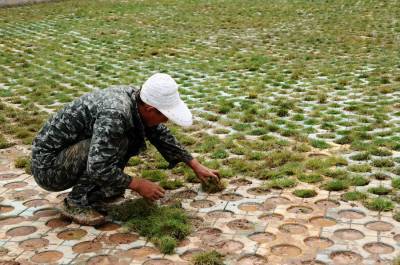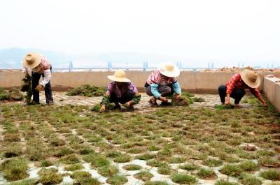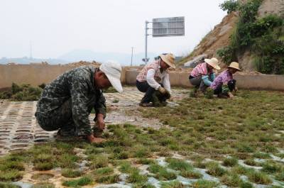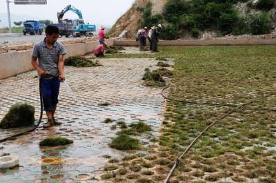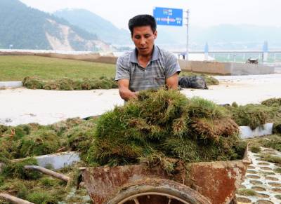 7月23日,园林工人正在郧县柳陂镇长沙路旁栽植草坪。为打造生态郧县,确保一江清水送北京,郧县对境内开山建设工程竣工后实行一律生态修复,栽植绿地、树木建造美景,保持水土,改善宜居环境。 夲报视界网周家山 赵弘然摄