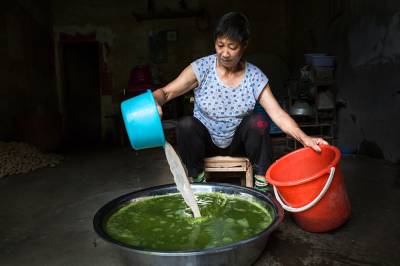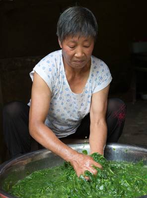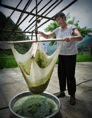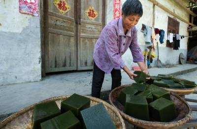 土家族乡间农妇常在劳作回家途中,连枝带叶信手撅回一束,摘下叶片洗净,放在盆中用烧开的清水烫熟,再用手揉成糊浆,倒入摇架中过滤,点入澄清了的适量草木灰水搅匀,片刻,便神奇般地成了一盆颤摇摇、绿幽幽、晶莹如玛瑙的“豆腐”。