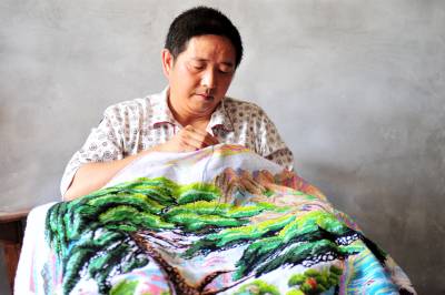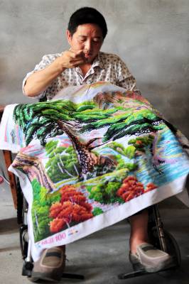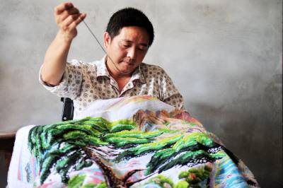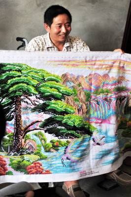 2014年7月22日,宜昌市夷陵区乐天溪镇兆吉坪村五组村民胡安双,坐在轮椅上缝制的一幅“迎客松”十字绣作品基本完工,这是他自2013年5月底搬进新居后完成的第三幅刺绣作品。