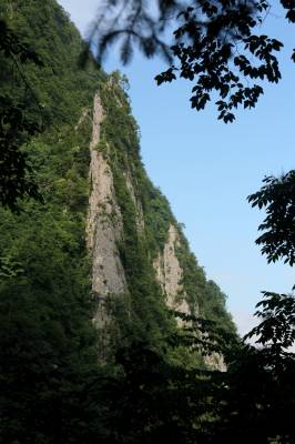 在十八里长峡自然保护区分布有奇特奇山异石,图为十八里长峡自然保护区枪刀岩的一角。
