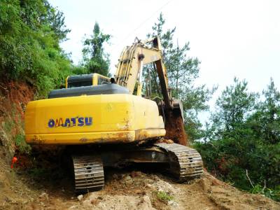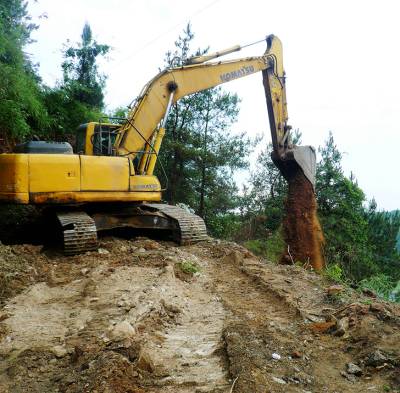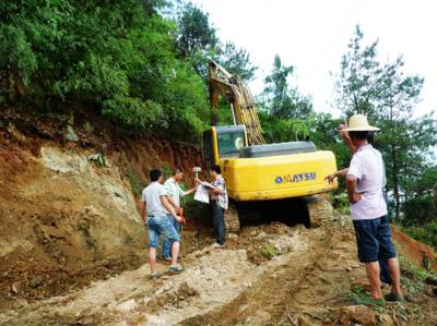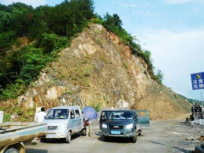 7月23日摄于南水北调中线复健工程——生态汉江郧县柳五路五峰乡大石沟口。由于该路扩建,路边崖顶出现众多超大悬石,欲掉未掉,危及该路车辆行人安全。路老板迅疾调来机械,爬上半山,实施紧急排险,确保该路车辆行人安全。图为机械在排险施工。(视界网 周宗华摄) 作者地址:郧县五峰乡政府
