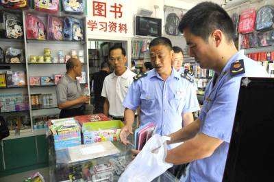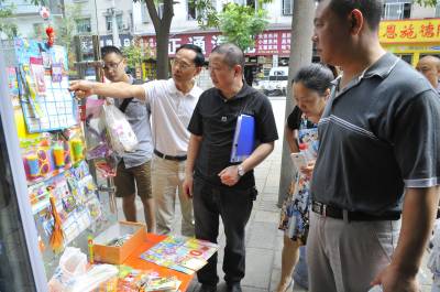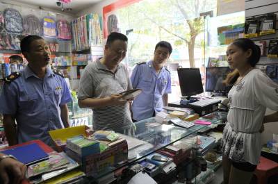 “暑期集中行动” 24日,执法人员对恩施城区校园周边店铺进行突击检查。 当天,恩施市文明委联合市教育局、卫计局、工商局、公安局、文体局、食药局、城管局等部门开展“暑期集中行动”,执法人员围绕荧屏声频、出版物市场、食品流通和校园周边环境等领域进行检查整治,依法打击违法违规行为,积极为未成年人营造健康、安全、快乐的暑期环境。(视界网 张艺馨 摄)