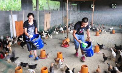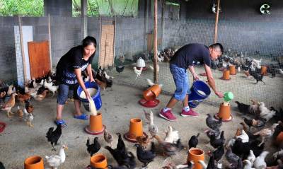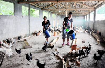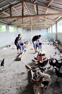24日,巴东返乡农民工向莉与他二婶陈德友正给土鸡添饲料。今年26岁的向莉在外打拼8年,2012年返乡创业与村民共投资25万元发展养殖专业,成立公司并注册为巴东县众晟养殖专业合作社,公司+农户模式,用无公害饲料喂养土鸡1.2万只,年收入10万元。(本报视界网穆世祝摄)