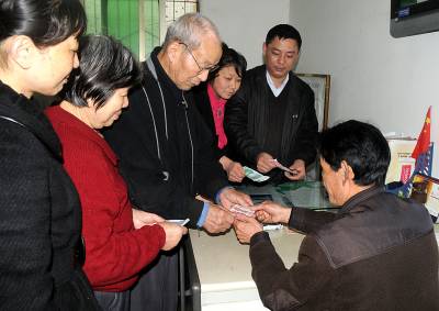 > 老党员冒雨献爱心