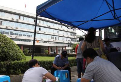 近段时间以来,由于高校学生放假离校,加之持续高温天气,街头献血人数骤减,导致恩施州血液库存严重告急,已连续一周低于警戒线,供血形势十分严峻。得知这一情况后,州四大家机关迅速行动起来,号召广大干部职工踊跃献血,用最无私、最伟大的实际行动践行党的群众路线。活动期间,填写表格的桌子不够,干部职工就蹲在地上把塑料板凳当桌子,或是在采血车车身上填写表格。排队等候献血的人群,感动了旁边执勤的安保人员,其中两人也加入到献血的队伍中来。