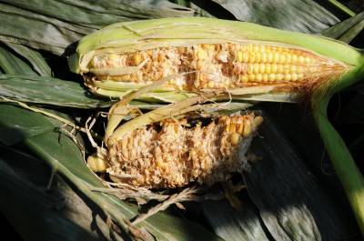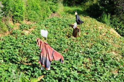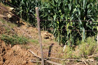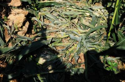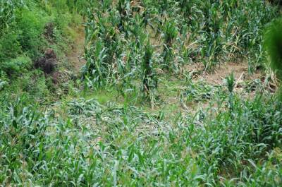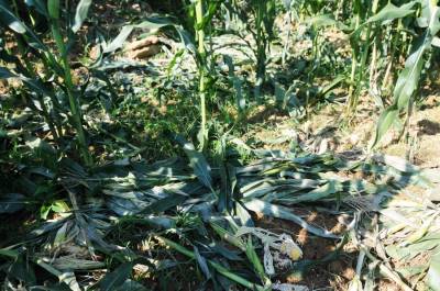 7月25日,笔者在郧县城关镇堰河村,洞耳河村,青曲镇红和村等多个村看到快成熟的包谷和红薯被野猪毁坏。同时还不断接到各乡镇村民电话反映野猪成群结队下地毀粮问题,时下正是秋粮生长期,早熟苞谷正在灌浆,红薯开始生长,但野猪带上一群猪崽一晚就可以毁坏一块地,村民夜晚只好看地护粮,但一有疏忽就被野猪钻了空子,村民只有采取各种办法防野猪毁粮,但野猪毁粮仍很严重。 图为被野猪毁掉的苞谷。 夲报视界网周家山 王燕摄