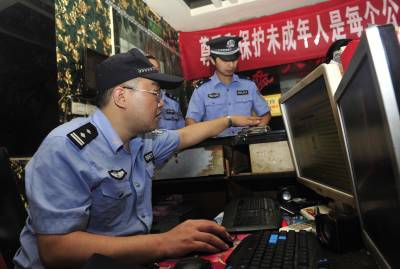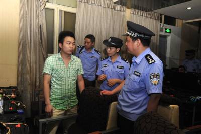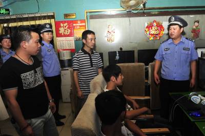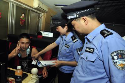 7月25日晚,公安民警在湖北恩施市一网吧检查网民身份证。